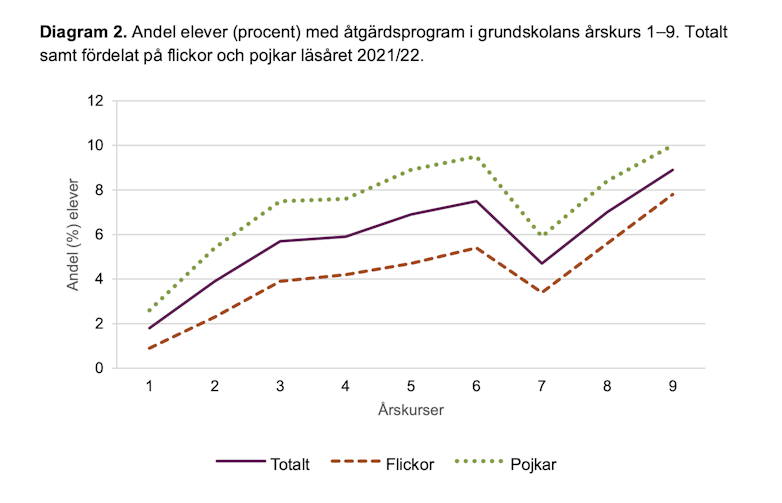 I årskurs sex har närmare 8 procent av eleverna åtgärdsprogram, i sjuan sjunker den siffran till 5 procent för att sedan öka gradvis till 9 procent i nian, enligt Skolverkets senaste statistik (se bild nedan). Åtgärdsprogram avslutas oftast i sexan, vilket innebär att ett nytt måste upprättas i årskurs sju.
