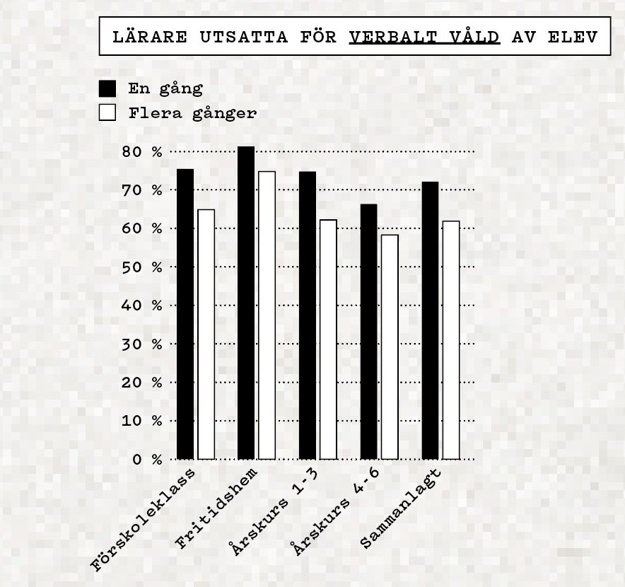 72 procent av lärarna säger att de utsatts för verbalt våld minst en gång de senaste åren. Nästan lika många, 62 procent, säger att det skett flera gånger.