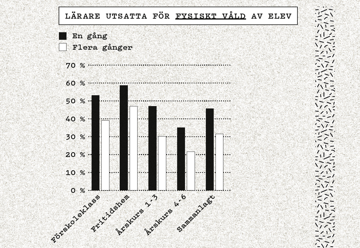 Av de närmare 1 000 lärarna i förskoleklass, fritidshem och årskurs 1–6 som svarade säger 45 procent att de utsatts för fysiskt våld av elever minst en gång de senaste två åren. Nästan var tredje, 31 procent, har utsatts flera gånger.
