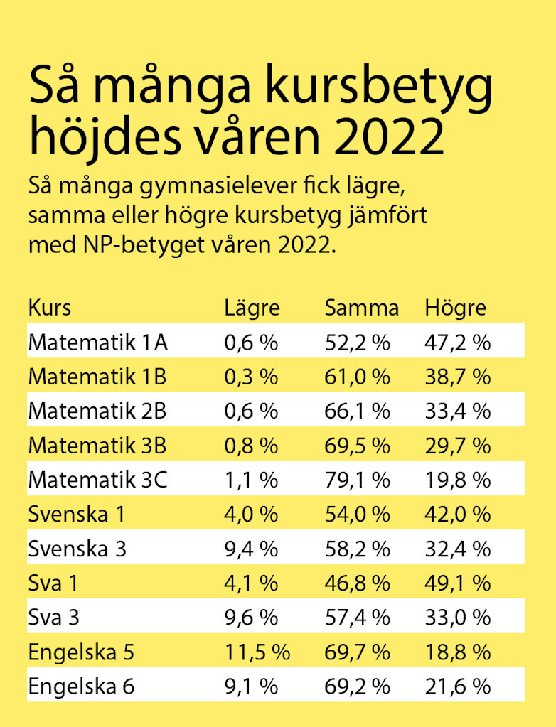 Men de usla provresultaten tycks inte ha påverkat kursbetygen nämnvärt. Hela 47,2 procent av eleverna fick nämligen högre kursbetyg än NP-betyg i Matematik 1A våren 2022.