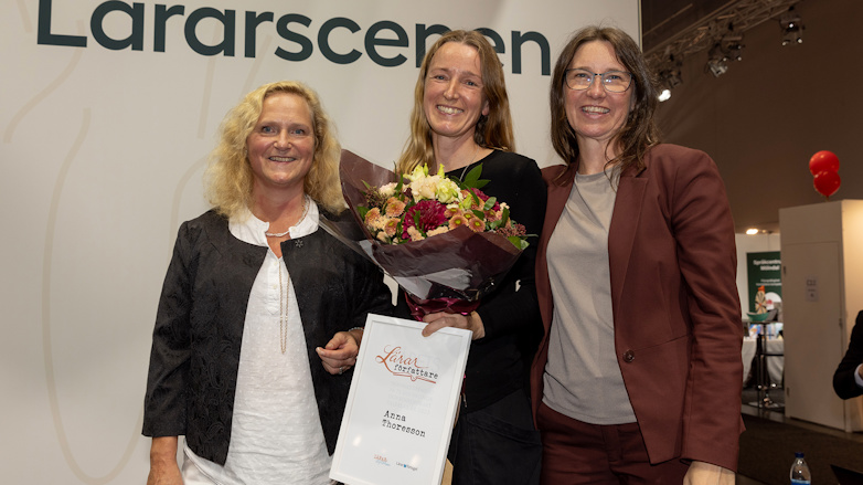 Lärarförlagets vd Anna Maria Thunman (till vänster) och Lärarstiftelsens generalsekreterare Malin Tufvesson (till höger) delade ut priset som Årets Lärarförfattare till Anna Thoresson.