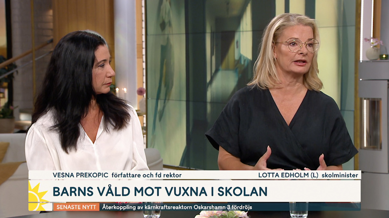 Vesna Prekopics och skolminister Lotta Edholm debatterar hot och våld i TV4:s morgonsoffa. Foto: TV4