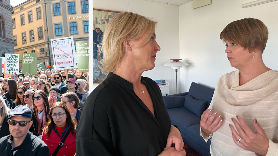 Kommunstyrelsens ordförande Katrin Stjernfeldt Jammeh (till höger) ser allvarligt på situationen i skolan, men kunde i diskussioner med Åsa Fahlén inte utlova att dra tillbaka delar av nedskärningarna på 201 miljoner kronor.