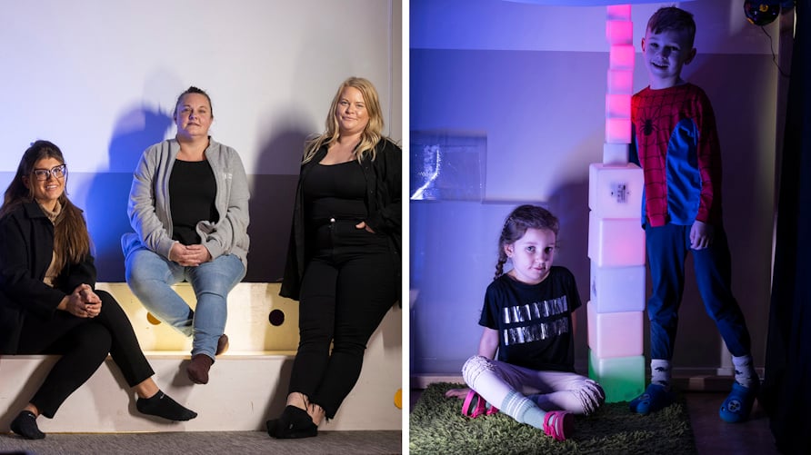 Förskollärarna Mariam Kourie, Mikaela Hynninen och Ellinor Hallerström ingår i ett IKT-nätverk i Södertälje. Vida och Benjamin bygger med ljuskuber som ändrar färg beroende på vilken sida som är uppåt. Foto: Johan Strindberg.