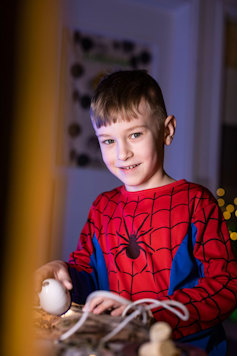 Benjamin undersöker naturmaterial med hjälp att ett webbägg.