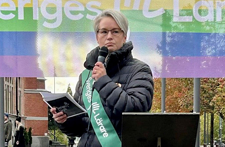 Lillemor Malmo, sfi-lärare och arbetsplatsombud för Sveriges Lärare höll tal i samband med manifestationen i Umeå.