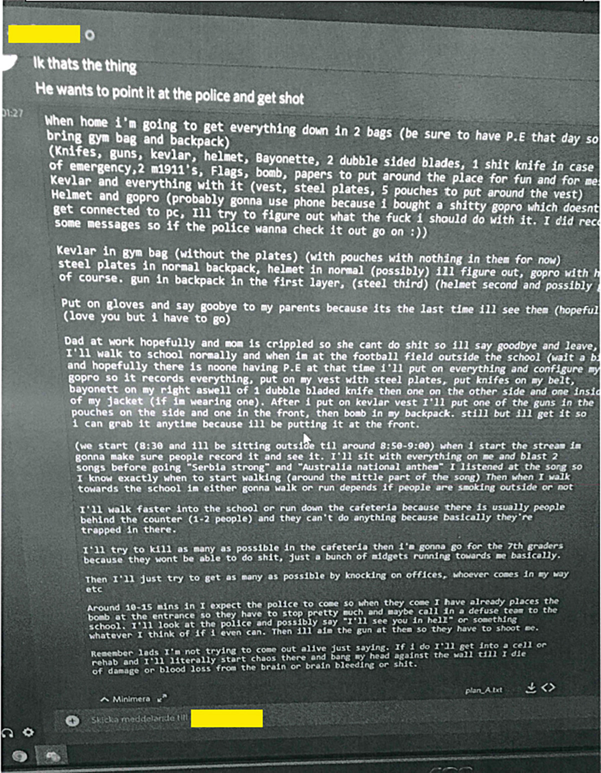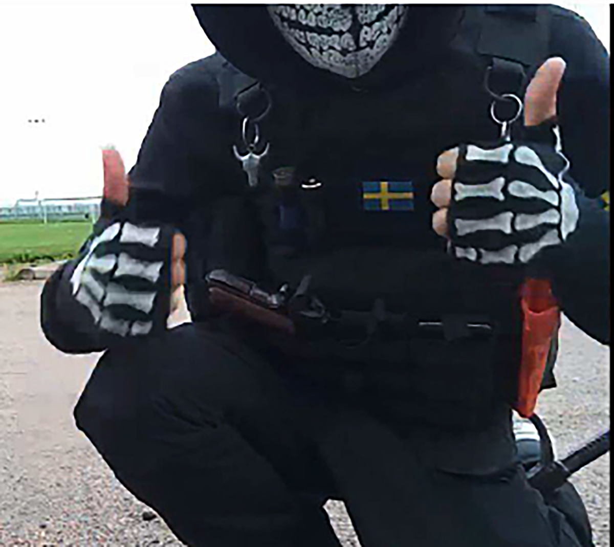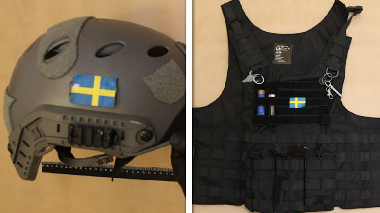 Till vänster: Stridshjälmen där den 15-årige eleven fäst en mobiltelefon som filmade hela attacken som sändes direkt på Twitch. Till höger: Skyddsvästen som 15-åringen använde i skolattacken i Eslöv. Han hade ett bälte med knivar och extra väskor fästa i den. Foto: Polisen