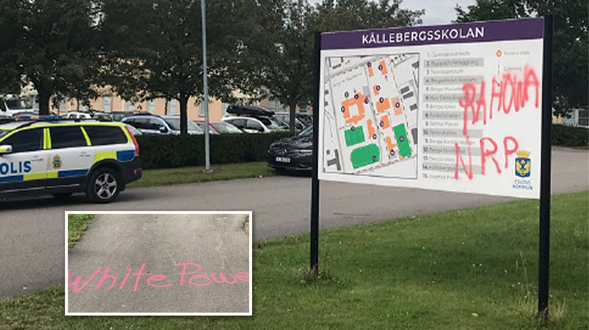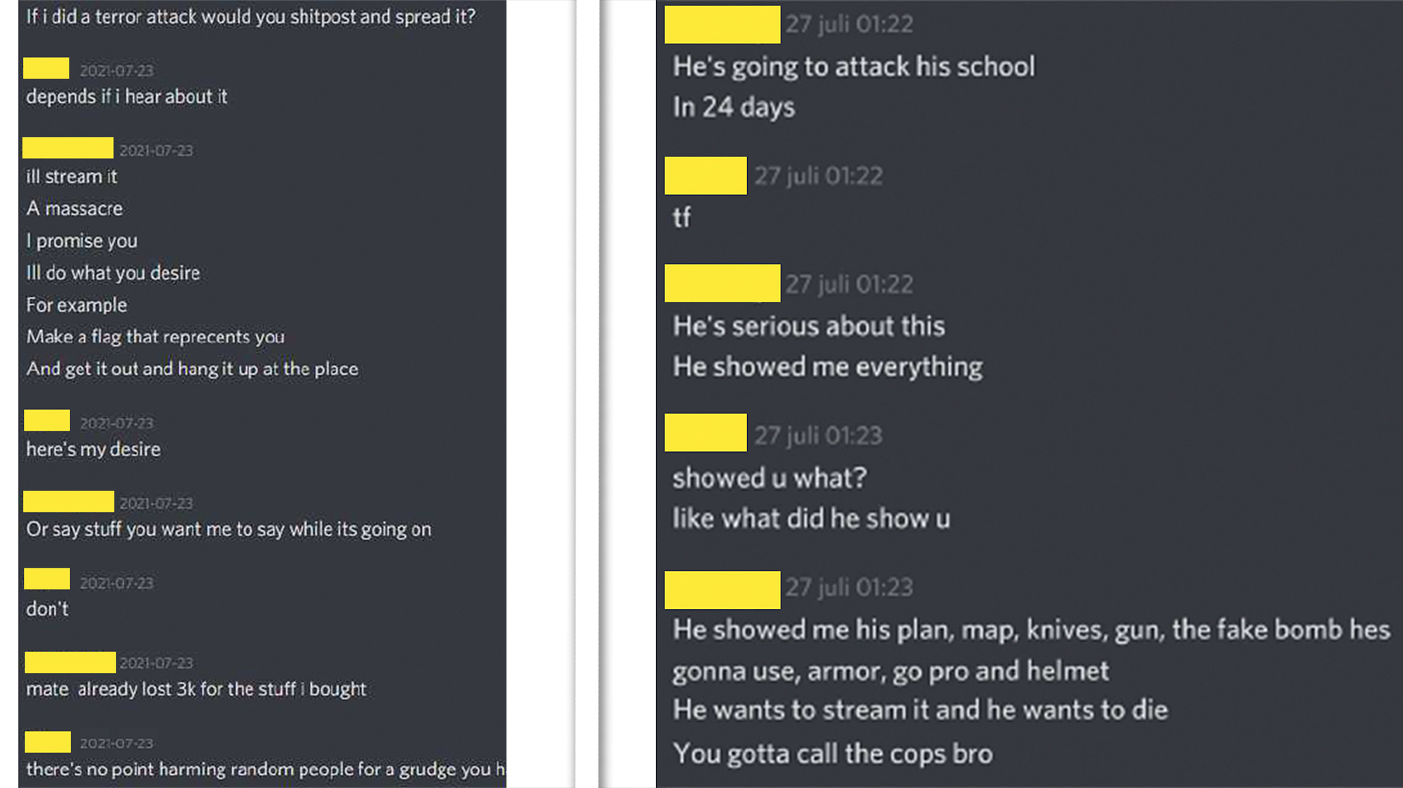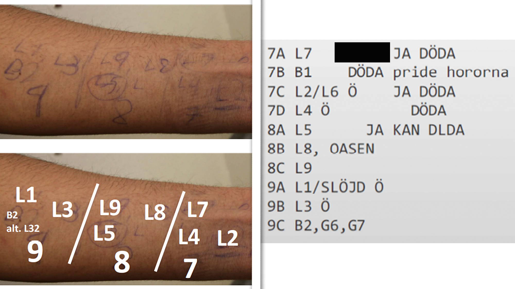 Till vänster: Stridshjälmen där den 15-årige eleven fäst en mobiltelefon som filmade hela attacken som sändes direkt på Twitch. Till höger: Skyddsvästen som 15-åringen använde i skolattacken i Eslöv. Han hade ett bälte med knivar och extra väskor fästa i den. Foto: Polisen