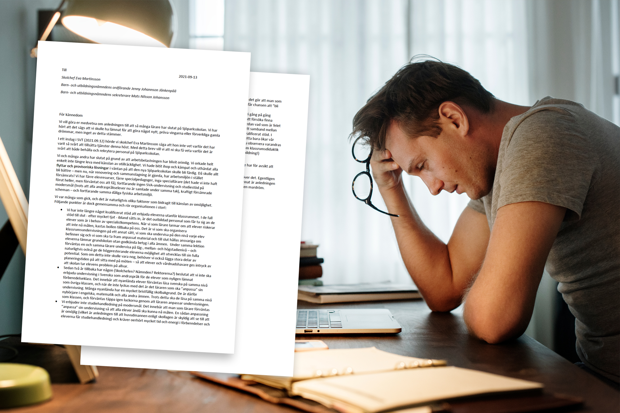 När skolchefen dök upp i SVT:s lokalnyheter och sade att hon inte förstod varför det var så svårt att rekrytera lärare till Sjöparksskolan reagerade vissa tittare extra starkt: Lärare som har sökt sig bort från samma skola eftersom de inte längre orkade slåss med vad de såg som ett omöjligt uppdrag. En arbetsbelastning de upplevde som orimlig ledde till en känsla av otillräcklighet som till slut drev dem att byta arbetsplats.