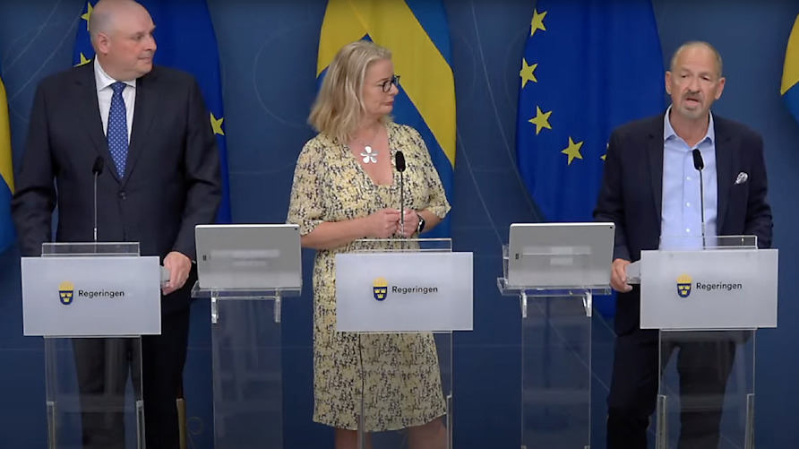 Skolminister Lotta Edholm (L) och Sverigedemokraternas Patrik Reslow presenterade utredaren Bo Jansson.