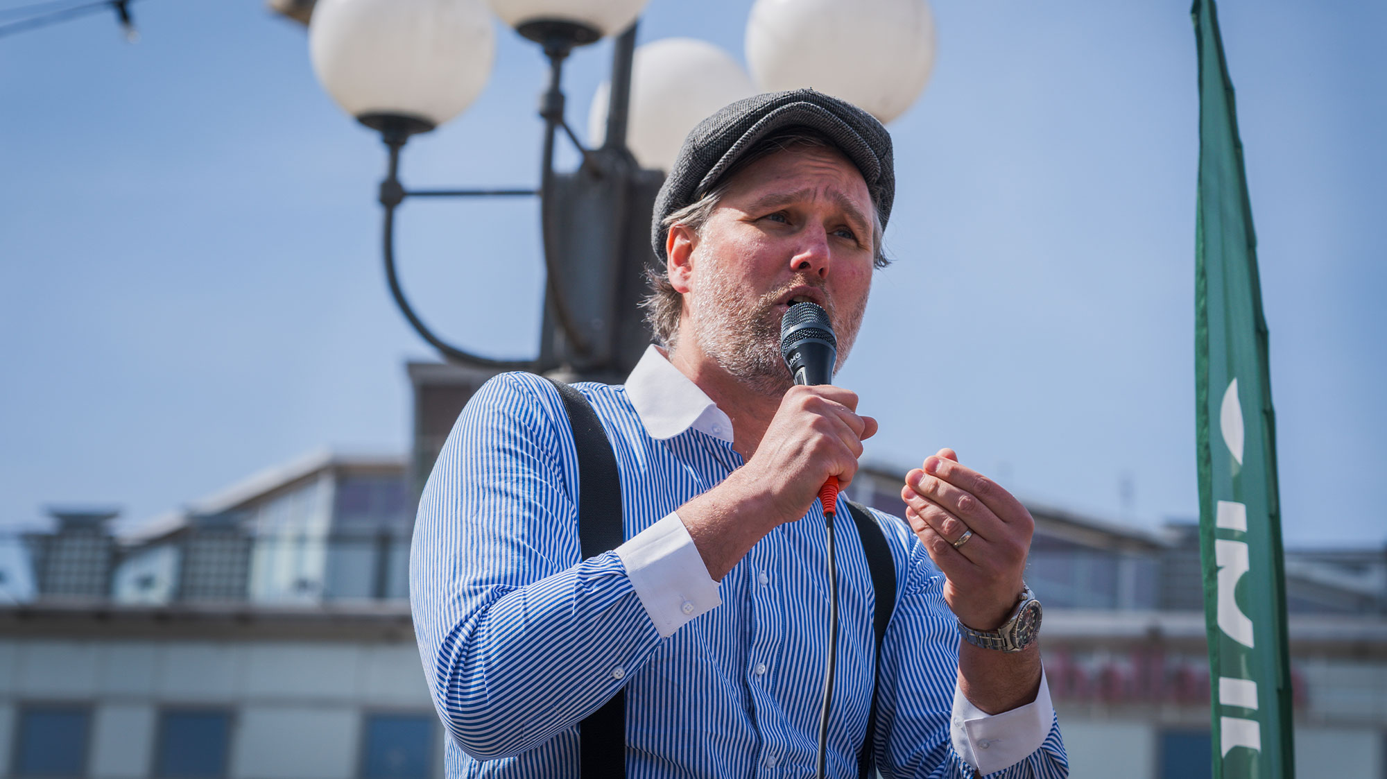 Robin Smith, vice förbundsordförande för Sveriges Lärare under manifestationen på Medborgarplatsen i Stockholm.