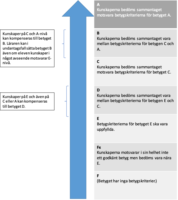 I dag ska alla delar av kunskapskraven för A, C och E betyg vara uppfyllda för att en elev ska få ett visst betyg. Med utredningens förslag om en kompensatorisk betygsättning behöver inte kunskapskraven för A-D vara helt uppfyllda utan läraren gör en sammantagen och ”allsidig” bedömning och sätter det betyg som bäst motsvarar elevens kunskaper.