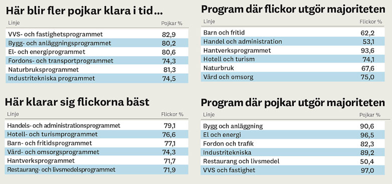 Värst är det på VVS- och fastighetsprogrammet där 97 procent av eleverna är killar. Det är också det program där högst andel pojkar når examen inom tre år: hela 82,9 procent av dem som gick ut 2019. Det är en högre siffra än för vartenda ett av de högskoleförberedande programmen, båda könen inräknade.