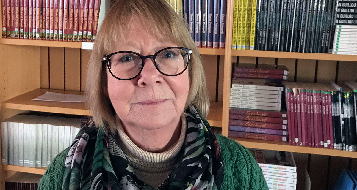 Eva Lindqvist började som lärare och fick en så kallad plocktjänst, det vill säga hon skulle undervisa i de ämnen ingen ville ha. Det blev gympa, musik och kristendomskunskap. <br />– Jag var fattig som en lus då och det där var den enda klänning jag ägde, säger Eva.<br />Foto: Lena Tallberg