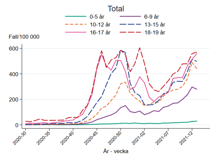 Folkhälsomyndighetens tredje och senaste kunskapssammanställning om covid-19 hos barn och unga visar att smittspridningen i den gruppen har ökat kraftigt sedan årsskiftet.