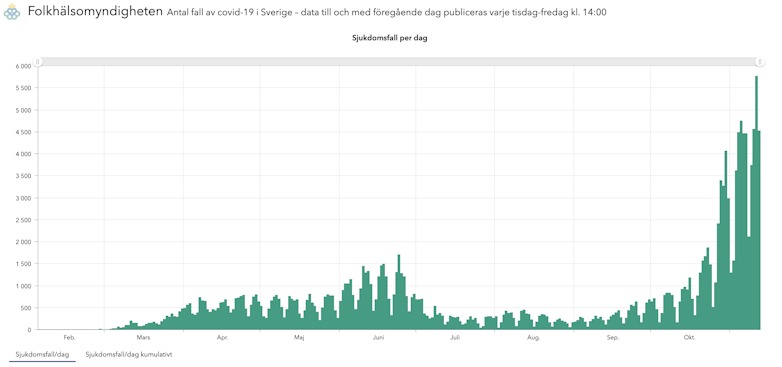 Men de färskaste siffrorna i rapporten är från 19 oktober, ett datum då smittspridningen befann sig i ett betydligt lugnare skede. Den dagen registrerade FHM 770 nya sjukdomsfall. Den 12 november är siffran 4 519 stycken.