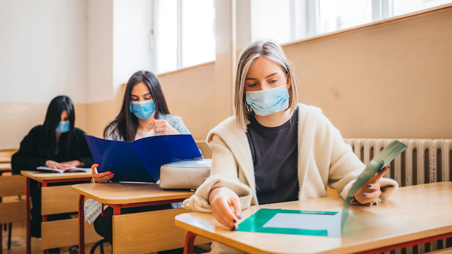 I Sverige kan en rektor göra riskbedömningen att personal ska använda munskydd, och då hänvisar FHM till arbetsmiljöverkets föreskrifter (AFS 2001:02).