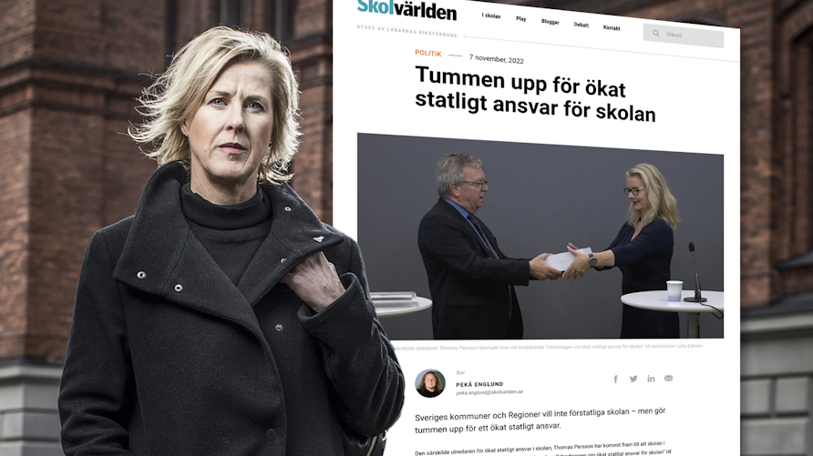 Staten måste ta ett större ansvar för skolans styrning, i synnerhet med tanke på likvärdigheten. Det slår utredaren Thomas Persson fast i det betänkande han lämnar över på måndagen. Betänkandet innehåller två förslag. Det ena är ”ett fullgånget förstatligande av den offentliga skolan”, en reform utredaren menar skulle ta 20 år att genomföra och betraktar som så genomgripande och svår att han i stället förordar sitt andra förslag: Ökat statligt ansvarstagande på flera områden, men inget övertagande av själva huvudmannaskapet.