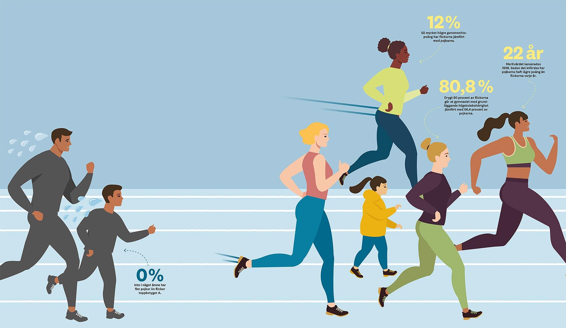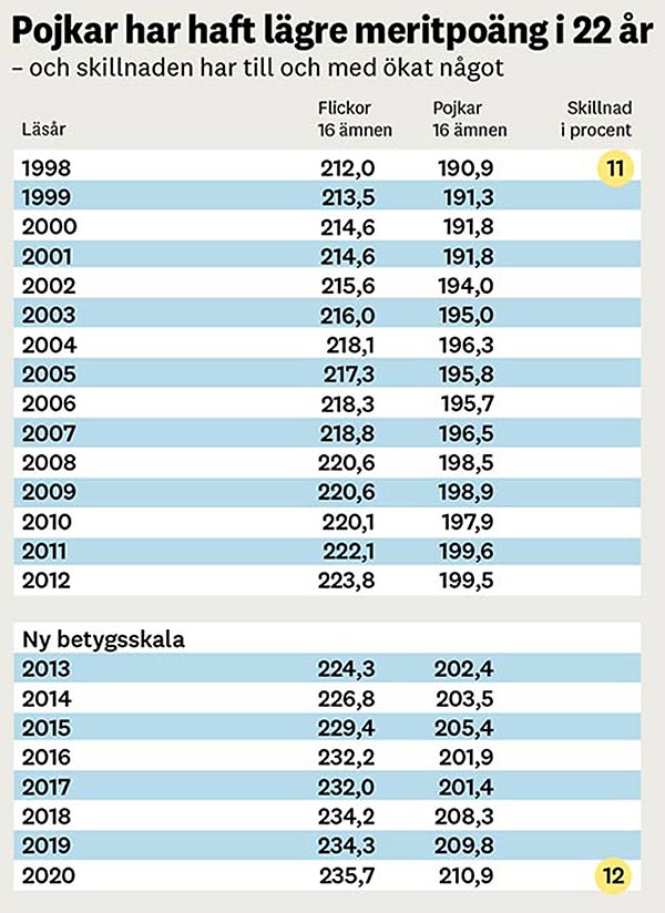 Meritvärden. 2020 hade flickorna 234,2 poäng i 16 ämnen mot pojkarnas 209,8. Även om meritpoängen ökat för både pojkar och flickor sedan meritvärdet lanserades 1998 har skillnaderna mellan könen ökat något. 1998 hade flickorna 11 procent högre meritvärden än pojkarna, mot 12 procent 2020.