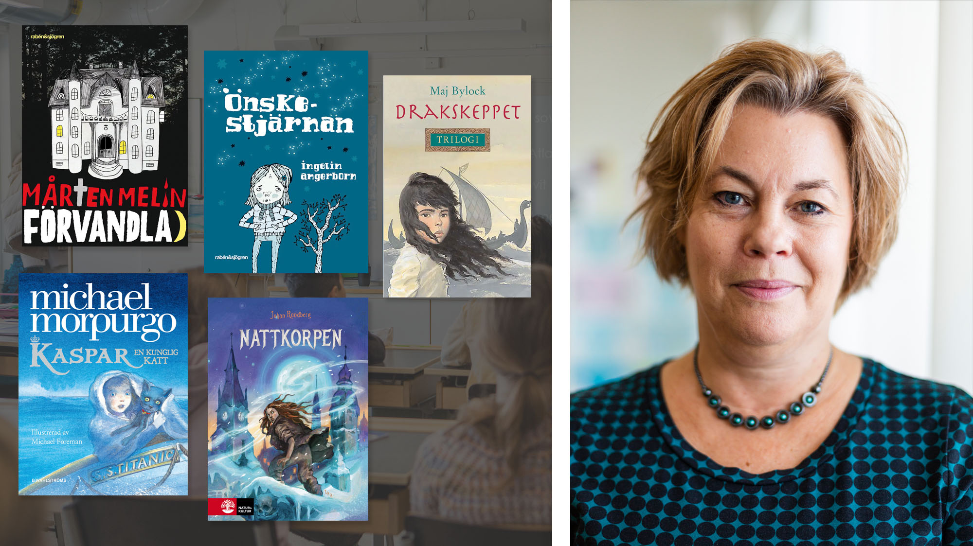 Stina Solums fem boktips till klassrummet: ”Kaspar, en kunglig katt”, ”Drakskeppet”-trilogin, ”Önskestjärnan”, ”Förvandlad” och ”Nattkorpen”.