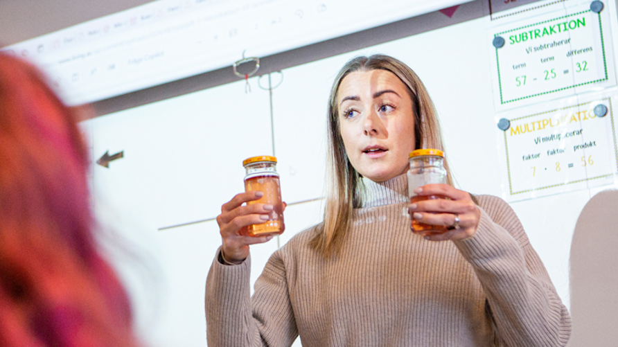 Läraren Maja Sundqvist visar två burkar med olika mängder vätska i, som en del av en lektion i algebra för klass 2.