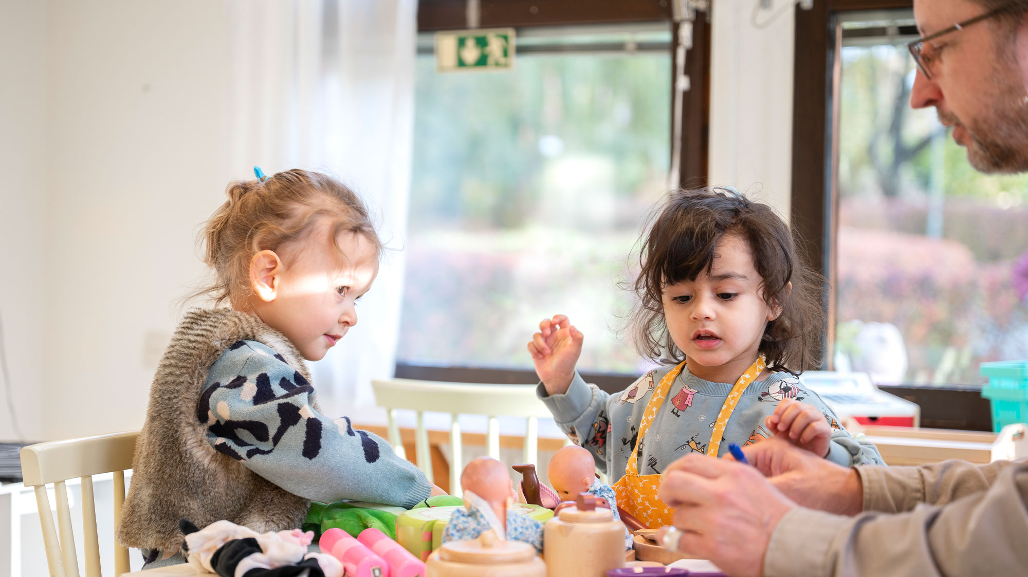 Carita Söderberg, lärare på förskolan Fröhuset, följer barnens samtal och lek.