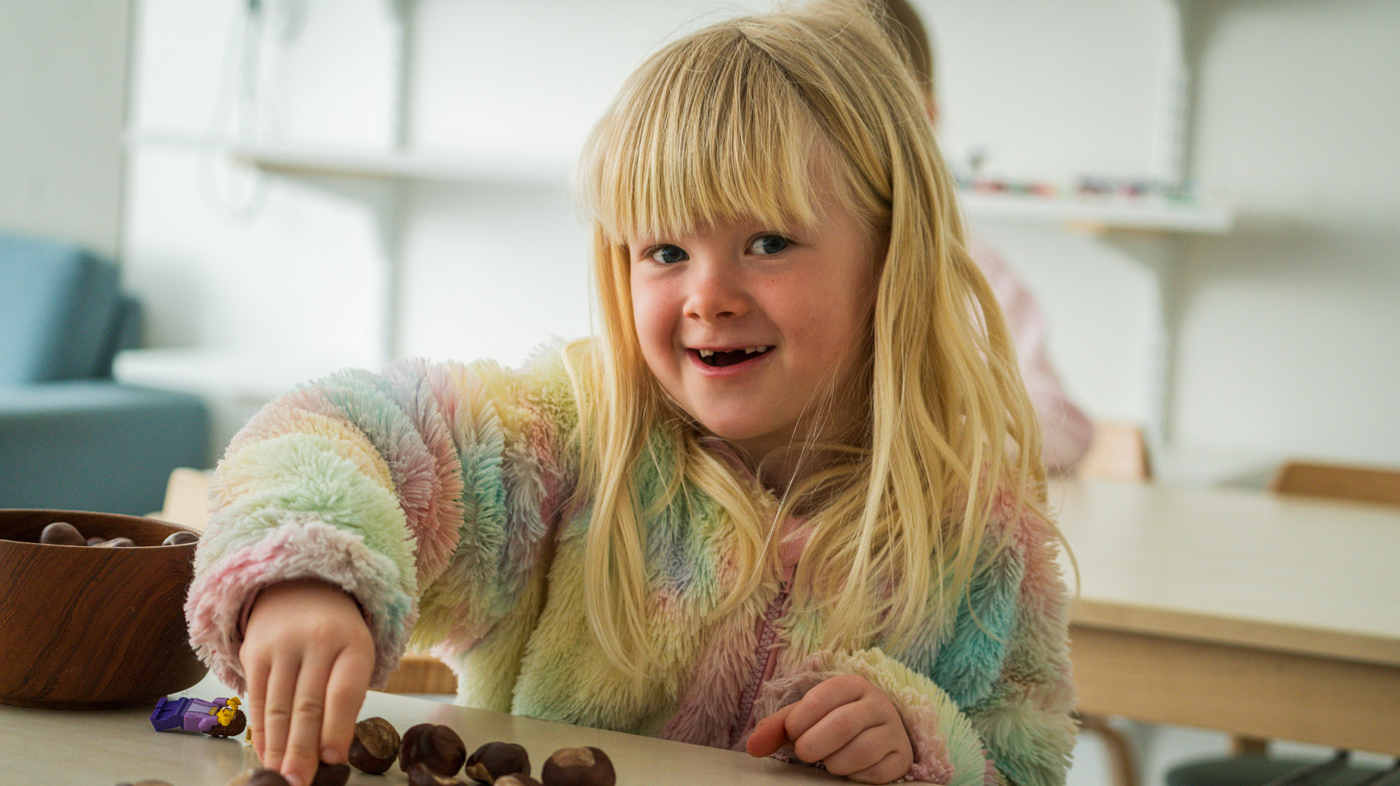 Alessia plockar kastanjer som hon ska lägga ut på tallinjen.