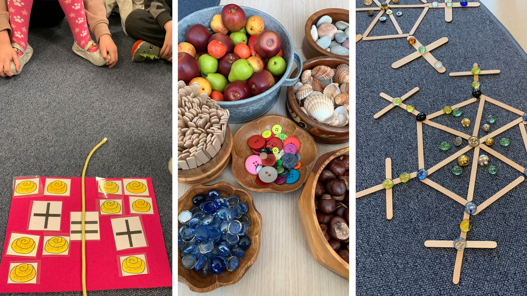 Med kastanjer, snöflingor och knappar undervisar Lena Wiklund förskoleklassen i allt från talmönster och division till geometri och pi.