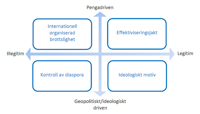 Ekonomisk brottslighet, effektiviseringsjakt, kontroll över utvandrade medborgare (diaspora) och ideologiskt riktad undervisning är fyra riskscenarier enligt FOI.