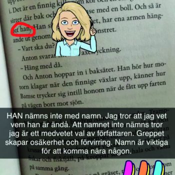 ”Snapchat är ett ypperligt verktyg för att få ungdomar att tänka kloka tankar kring skönlitteratur. Konceptet kallas för Booksnaps. Du fotar en sida av boken, markerar passagen som du vill uttrycka en tanke om, använder textverktyget för att formulera din tanke och kryddar med symboler för att förstärka känslan. Som en läslogg på ett mer lättsamt och kreativt sätt i en arena där ungdomarna är bekväma. Att använda sin privata mobil med Snapchat är alltid ett val och man kan även göra Booksnaps i exempelvis Google Presentationer eller Bookcreator”.