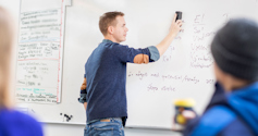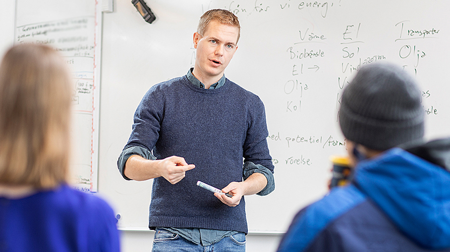 – Men just nu uppehåller vi oss vid energi som konkret bränsle. Det är ju inte så att om jag äter en lärobok så orkar jag springa längre, säger han till eleverna.