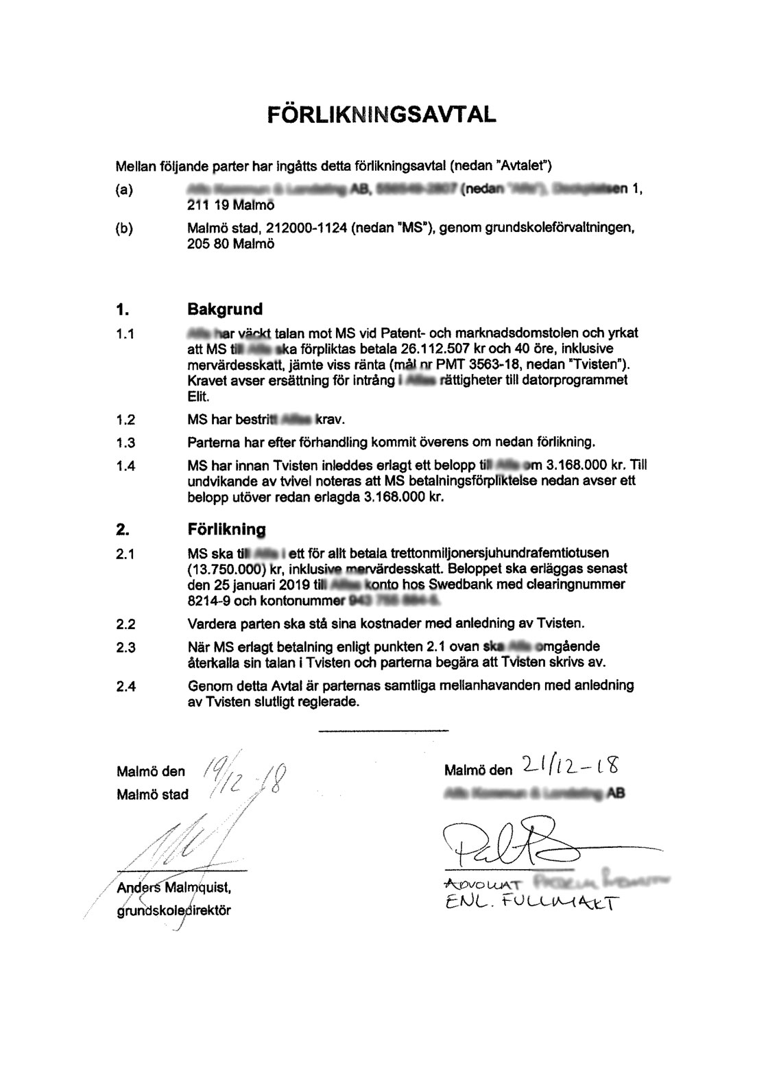 Förlikningsavtalet där Malmö stad fick betala skadestånd.