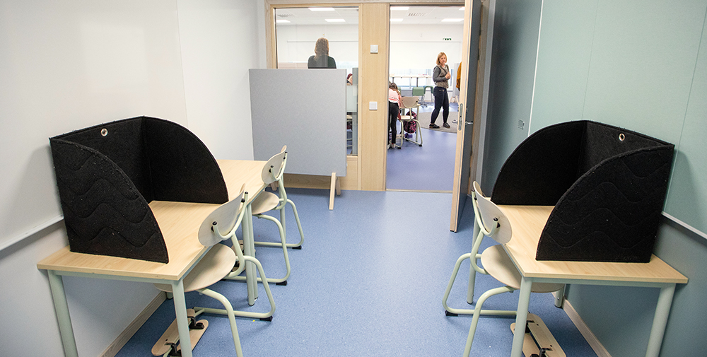I varje klassrum har man satt in höj- och sänkbara bord till eleverna, ljudabsorberande golvskärmar mellan borden, och möjlighet till bildstöd framme vid whiteboardtavlan för alla elever.