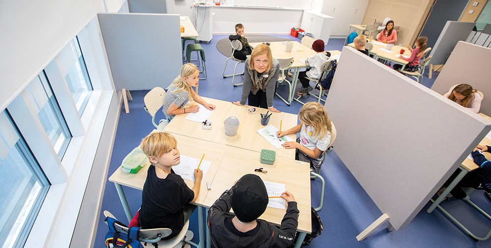 – Förut blev jag påverkad av andra klasser som sprang runt i korridoren och på skolgården. Men när man stänger dörren till klassrummet på den nya skolan så stänger man ute allt ljud. Det har blivit en bättre arbetsmiljö för oss lärare – det säger all personal, säger hon.