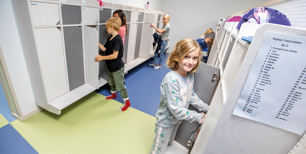 – Annars brukar skolhallar på låg- och mellanstadiet vara fulla med vinterjackor och väskor i olika färger som hänger och stör eleverna. Vi har i stället valt att skala av, säger Madeleine Jansson.