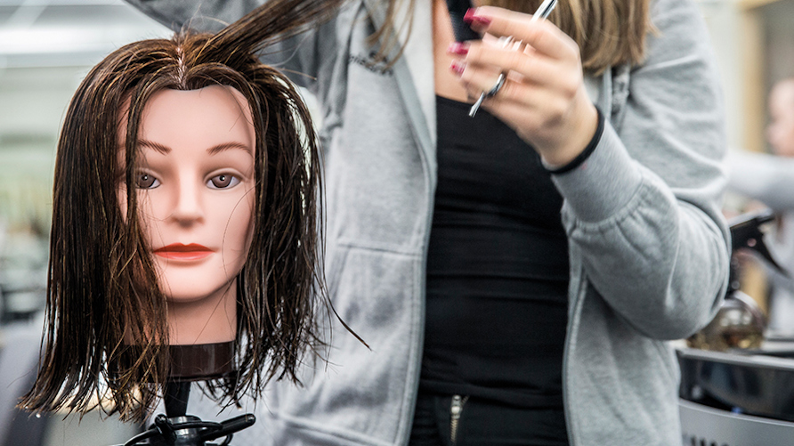 I frisörsalen på Grillska gymnasiet i Uppsala pågår det som brukar pågå i en salong. Hår tvättas, fönas, lockas och klipps. Den största skillnaden är att de flesta i klassen, så här ett par månader in på första terminen, har ett dockhuvud mellan sig och spegeln.