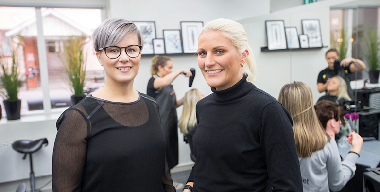 Frisörlärarna Ann-Sofie Pasalic Nilsebo och Elin Carlsson har slagit sig ner i varsin röd fåtölj utanför klassrummet. De hann båda jobba många år som frisörer innan de sadlade om till lärare och nu diskuterar de skillnaderna mellan sina båda yrken.