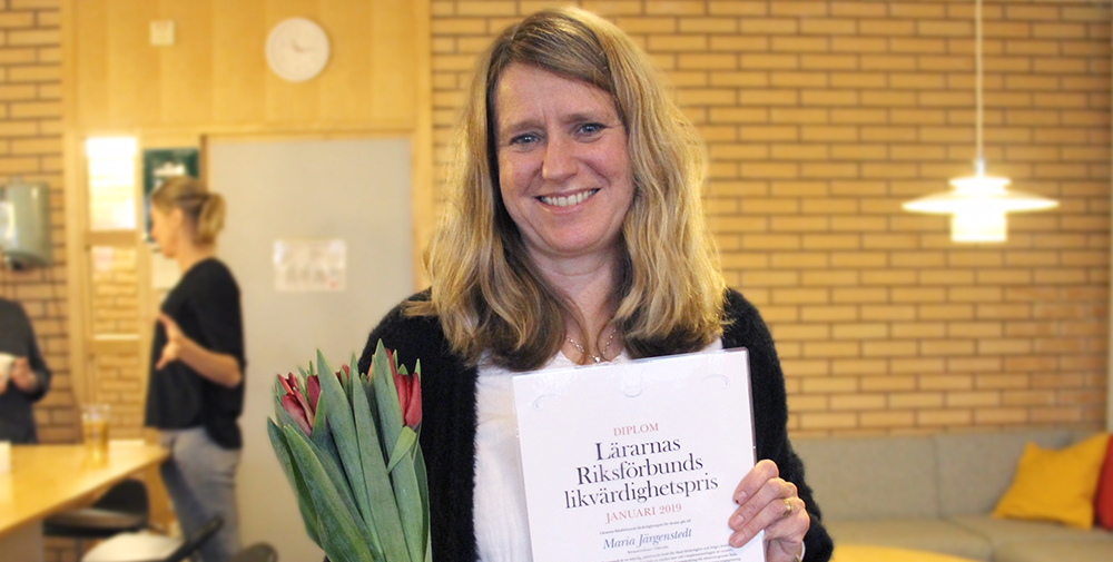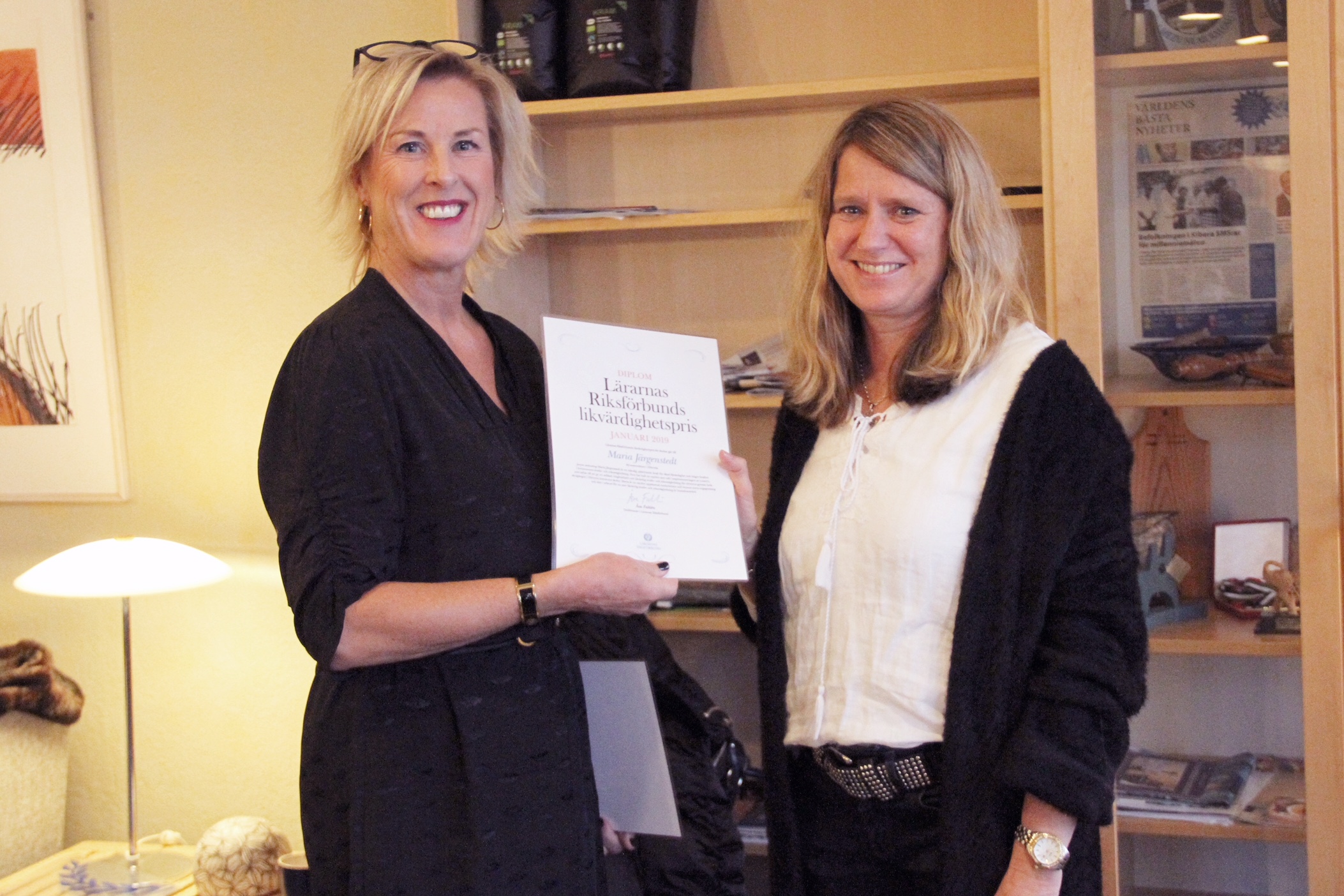 Åsa Fahlén, Lärarnas Riksförbunds ordförande, var på plats i Härryda för att överlämna priset till Maria Järgenstedt.