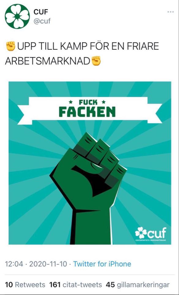 10 november: Centerpartiets ungdomsförbund återupplivar sin slogan från 2010, ”Fuck facken”, med en bild på Twitter som mystiskt försvinner från kontot samma dag. Men internet glömmer aldrig och här är den: