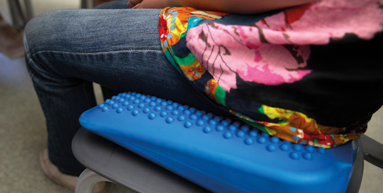 Klass 8D har bänkat sig för dagens första lektion – svenska. Några elever sitter i grupper runt sammanfösta bord, andra håller till vid ståborden längst bak i klassrummet. Ingen använder för tillfället de avskärmade, enskilda platserna som finns utefter den ena långsidan. De flesta sitter på vanliga stolar, med eller utan kudde, någon föredrar en pilatesboll.