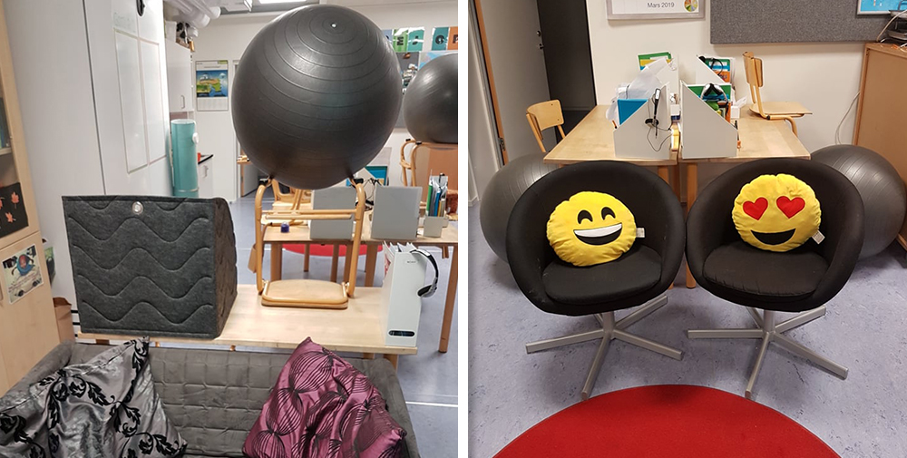 Till vänster: I klassrummet finns det en soffa, skärmar och pilatesbollar.Till höger: Två fåtöljer som står framför några bord längre bak i klassrummet. Fåtöljerna kan flyttas runt i klassrummet. Foto: Frida Heerman.