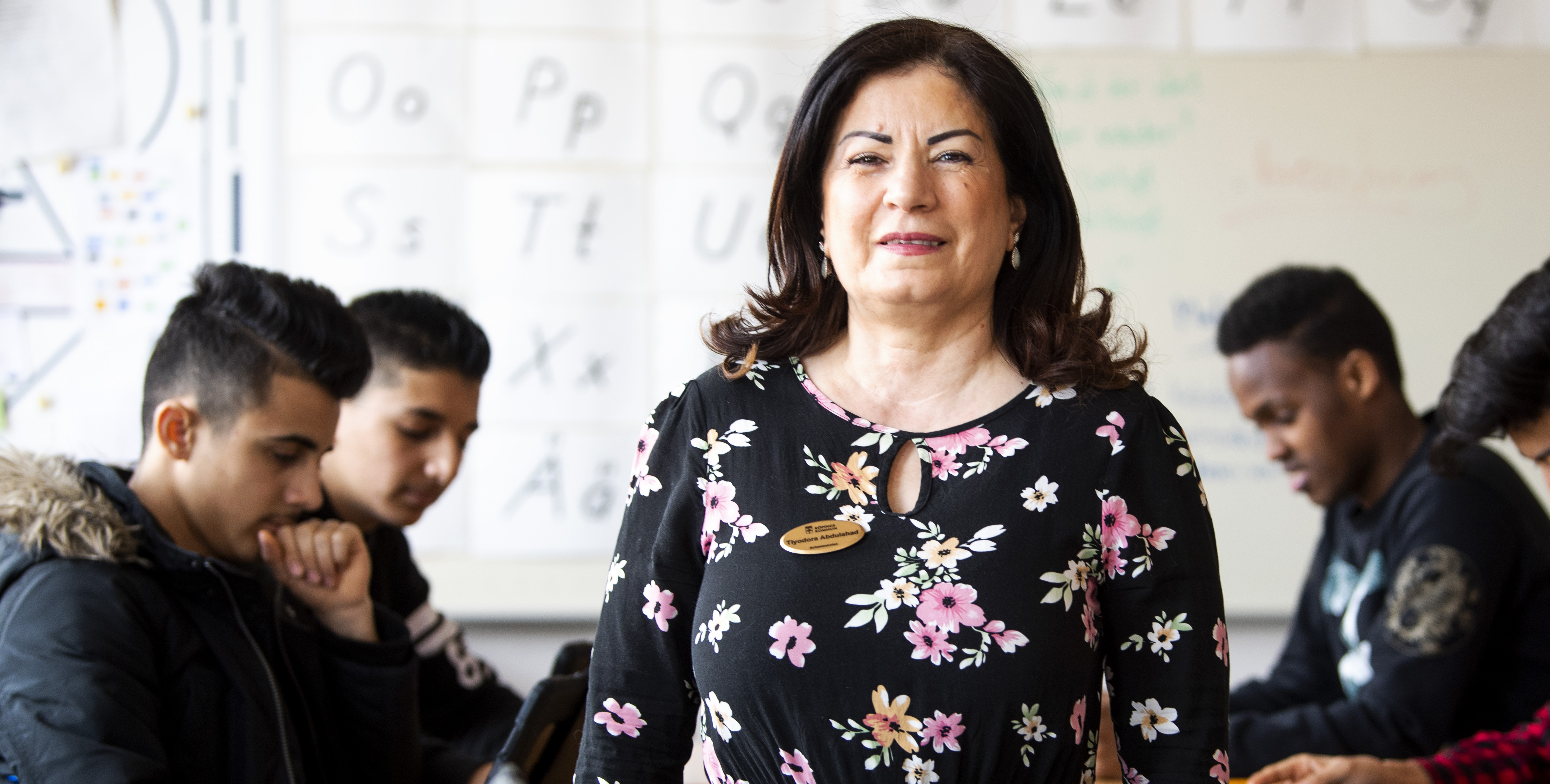 Själv flyttade hon från Syrien till Sverige i början av 1990-talet, erfarenheter hon ofta delar med sig av till sina elever.