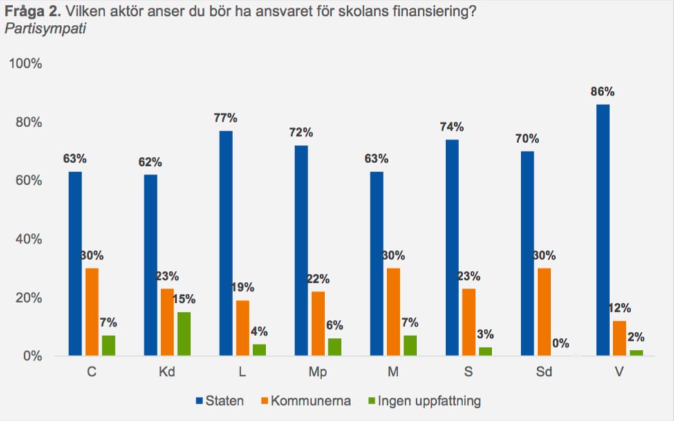 På frågan ”vilken aktör anser du bör ha huvudansvaret för den offentligt drivna skolan?” svarade hela 83 procent hos Vänsterpartiets väljare att staten bör ta över de kommunala skolorna. Den minsta majoriteten av de åtta riksdagspartierna återfinns hos Centerpartiets väljare, där siffran ligger på 61 procent.