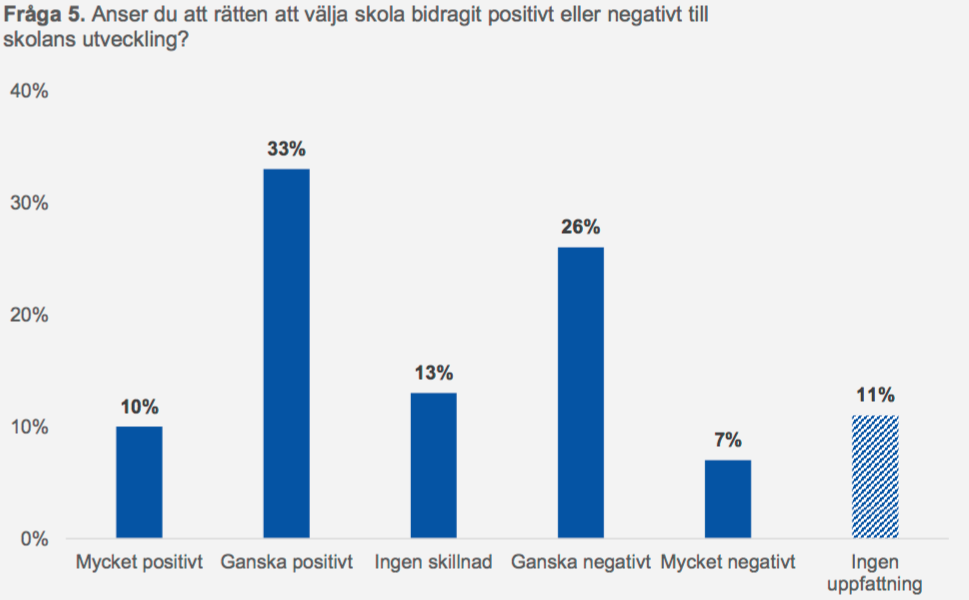 När det däremot gäller huruvida friheten att välja skola har bidragit positivt eller negativt till den svenska skolan är väljarna betydligt mer splittrade. 43 procent svarar att valfriheten har bidragit ganska positivt eller mycket positivt till skolans utveckling, medan 33 procent svarade ganska negativt eller mycket negativt.