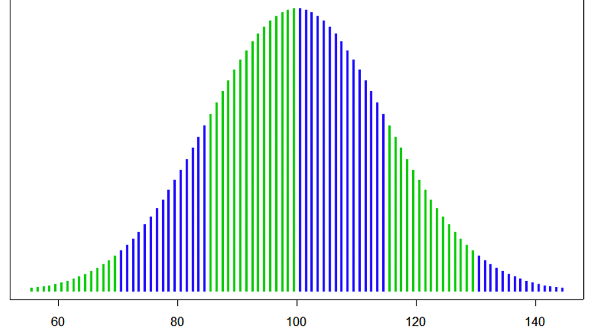 Normalfördelningskurvan kan förstås också appliceras på människors intelligenskvot och tittar vi på diagrammet ser vi tydligt att den stora majoriteten av människor har ett iq mellan 90–100 och dessa betecknas därmed som ”normalbegåvade”.