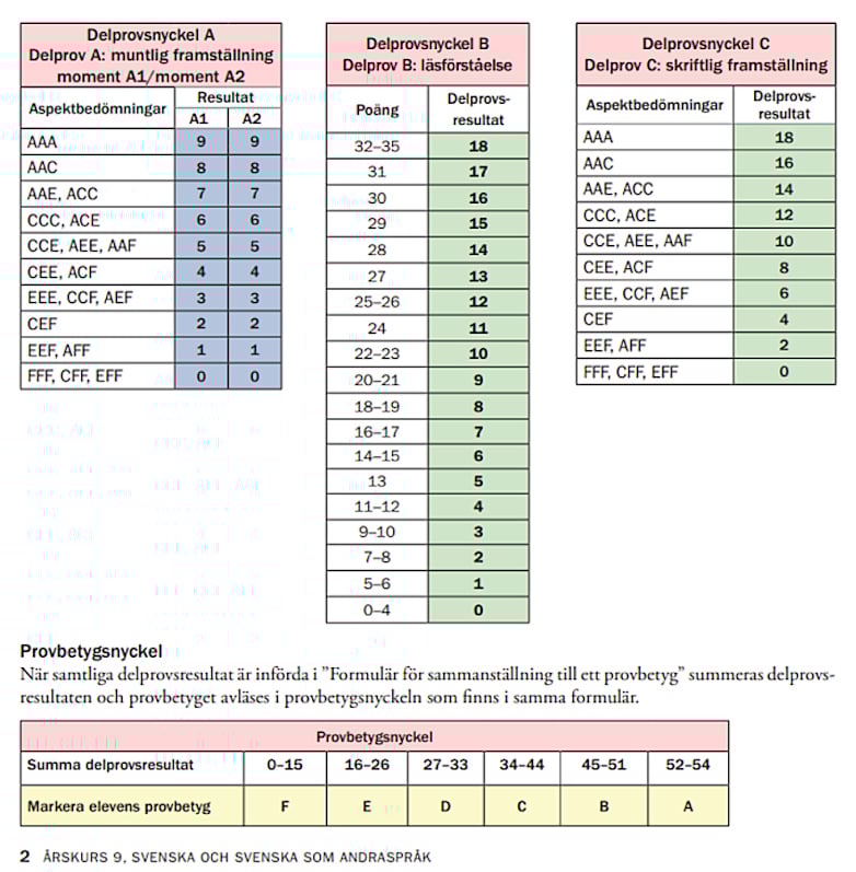 Som du ser i bilden nedan är gränsen för godkänt 16 poäng. Till exempel kan en elev ha noll poäng på läsförståelsedelen, men ändå klara sig igenom provet genom att plocka poäng på den muntliga delen, uppsatsen och ändå totalt klara gränsen för provbetyget E.
