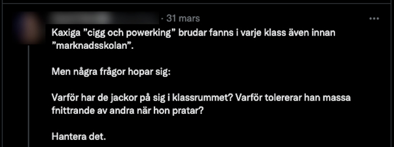 I mitt Twitterflöde ser jag en politiker dela ett filmklipp. Det är en elev som uppenbart smygfilmat när hen ifrågasätter en lärare. Politikern är upprörd. Men bestörtningen beror inte på det faktum att det sprids en film på sociala medier föreställande en lärare i utsatt position. Istället har politikern åsikter om skolsituationen. Om läraren bara hade varit skarpare i tonen, delat ut order tydligare, om hen bara hade satt hårt mot hårt hade situationen aldrig uppstått från första början. Politikerns tweet får över 700 likes.