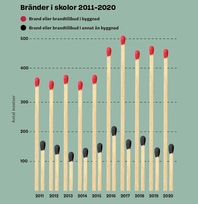 Källa: Forskningsrapporten "Anlagd brand i skolor och förskolor – Trender och uppföljning av åtgärder", genomförd av insamlingsstiftelsen Brandforsk (grundad av Brandskyddsföreningen).