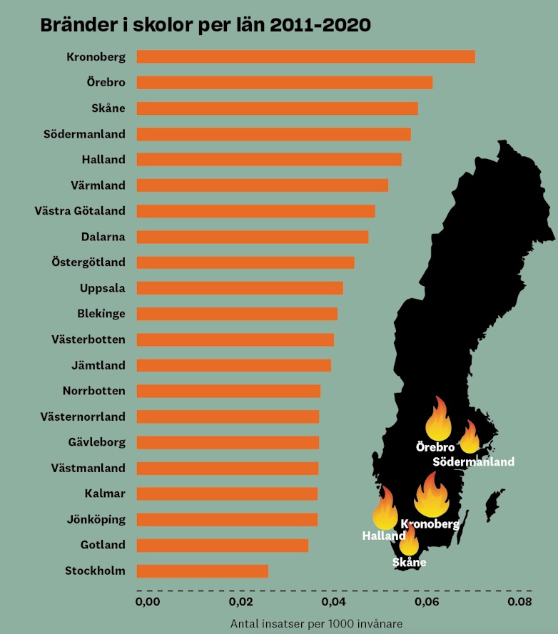 Kronoberg, Örebro och Skåne. De har haft flest skolbränder per invånare 2011-2020.