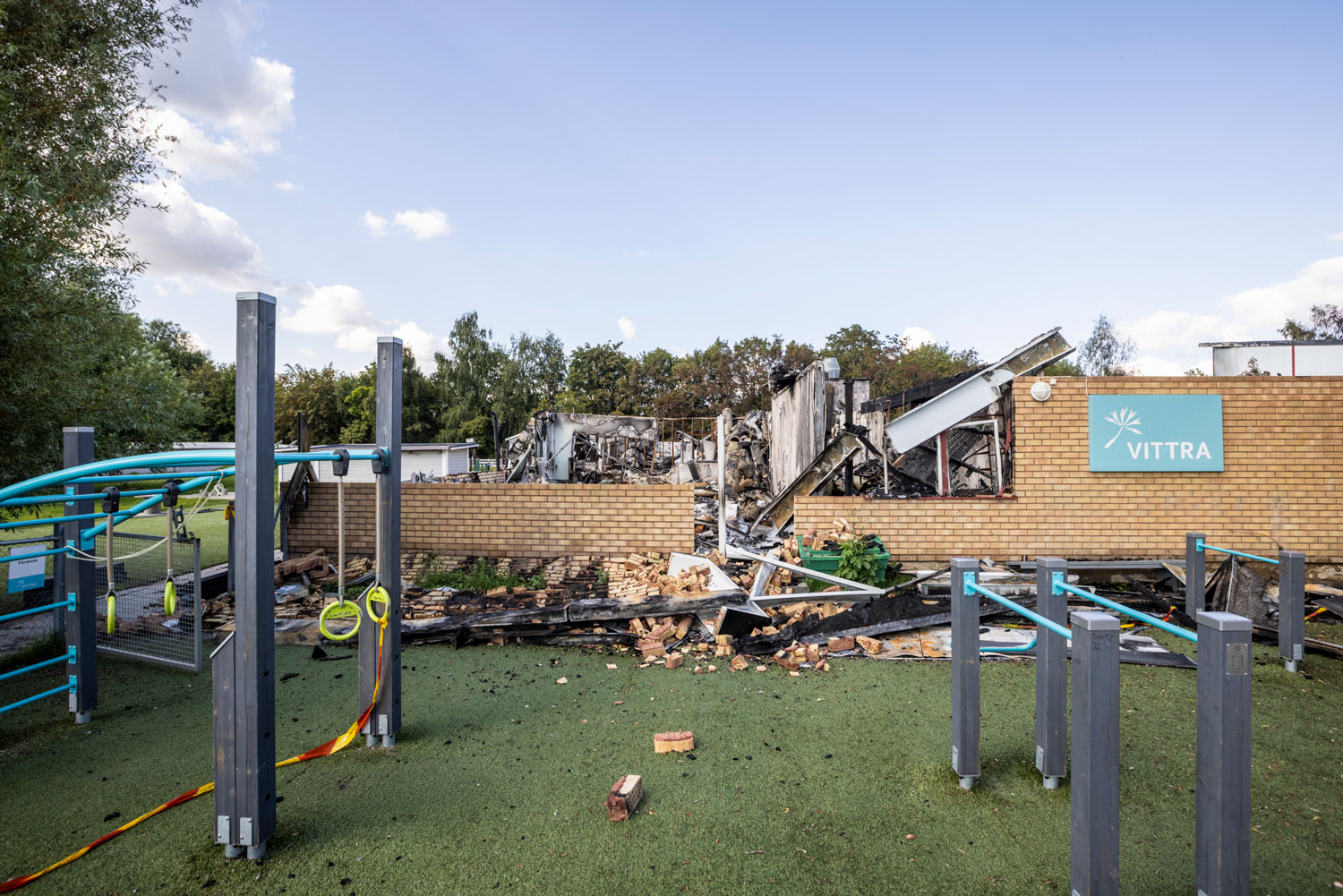 Då är då och nu är nu. Höstterminen 2021 är igång och där det tidigare var personalparkering finns nu en innebandyplan med tillhörande sarg som skolan har lånat av den lokala klubben. Det provisoriska staketet runt den tillfälliga skolgården har pyntats med flaggor för att öka trivselkänslan. Byggnaden där högstadiets elever och lärare håller till finns kvar, men i övrigt står det som var Vittra Kungshagen i ruiner.